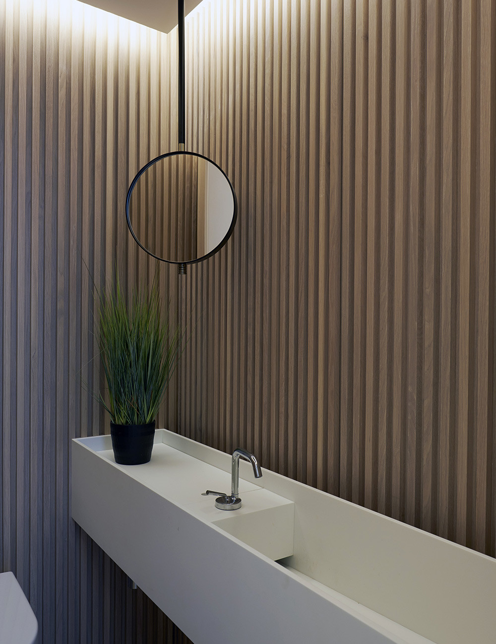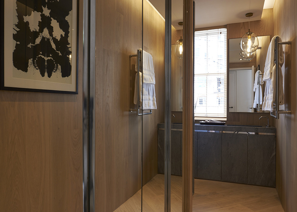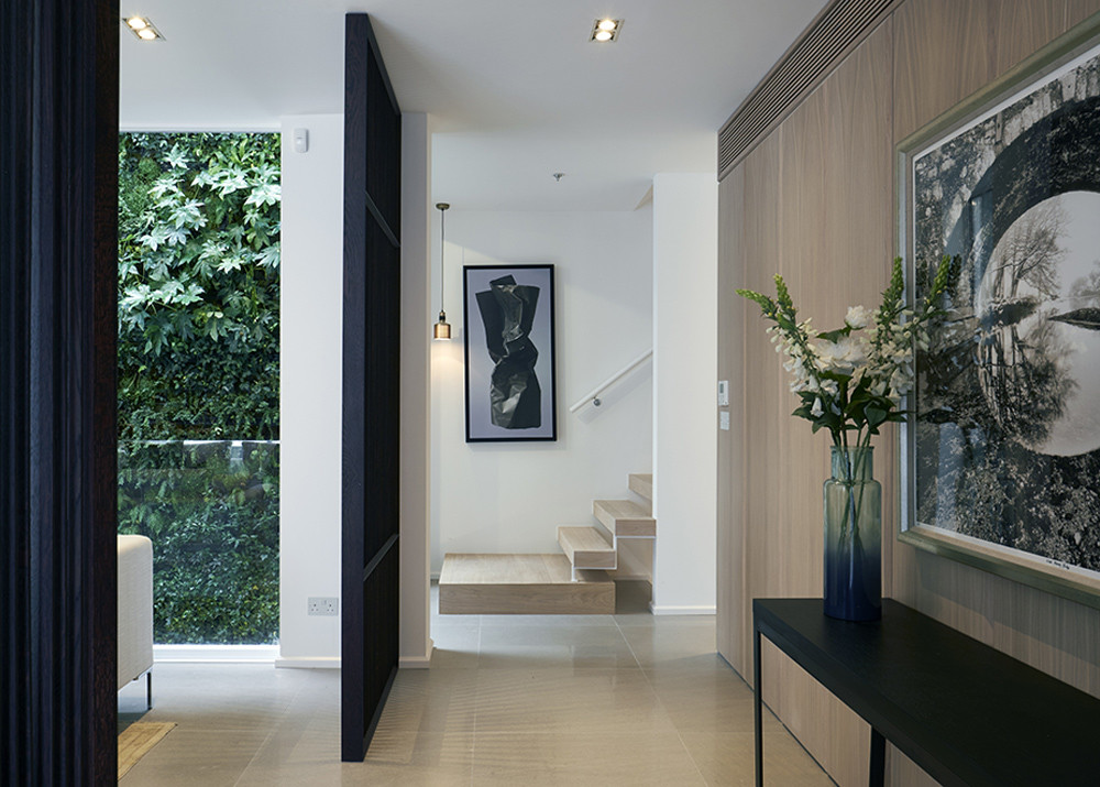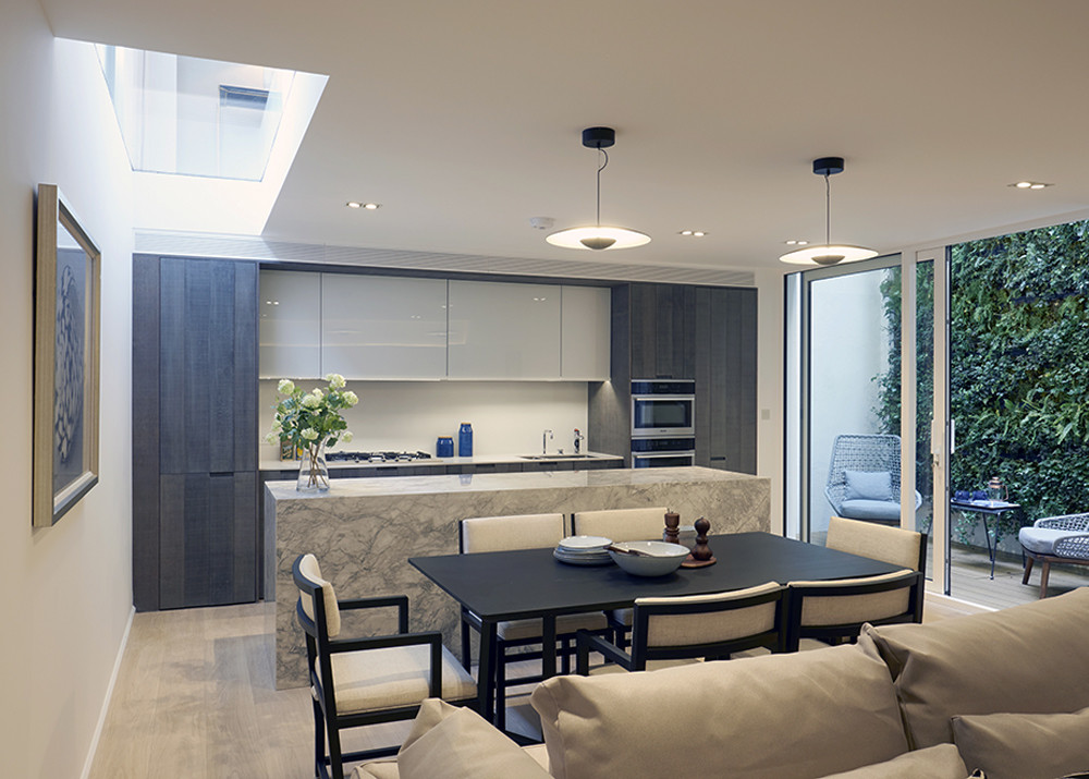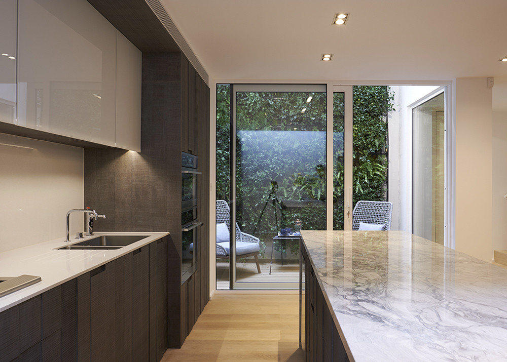 A basement dig allowed for a family room kitchen with natural light flooding through a glass floor placed beneath the front window on the ground floor. A light well was created up the back of the house with a full height living wall which can be enjoyed from the ground floor living space, master bedroom and through to the top floor living area. An upper terrace that was previously overlooked is now enclosed with a state of the art glass roof which can be opened remotely.